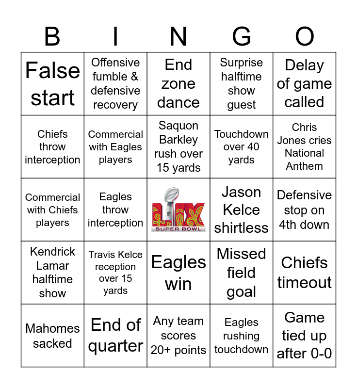 This bingo card has a free space and 49 words: Chiefs passing touchdown, Eagles passing touchdown, Chiefs rushing touchdown, Eagles rushing touchdown, Defensive stop on 4th down, Taylor Swift hugs Brittany Mahomes, Offensive fumble & defensive recovery, 2 point conversion, Touchdown over 40 yards, President Trump shown, Chiefs throw interception, Eagles throw interception, Missed field goal, Game tied up after 0-0, Eagles field goal, Chiefs field goal, End zone dance, Jason Kelce shirtless, Challenge flag thrown, False start, End of quarter, Any team scores 20+ points, Surprise halftime show guest, Delay of game called, Roughing the passer called, Travis Kelce reception over 15 yards, Saquon Barkley rush over 15 yards, Eagles timeout, Chiefs timeout, Kendrick Lamar halftime show, Chiefs win, Eagles win, Fan looks surprised, Fan in stands crying, Mahomes sacked, Peyton wins KOD3, President Trump shown, Hurt Sacked, Chris Jones cries National Anthem, Mention Saquon Barkley's birthday, Mardi Gras beads thrown, AJ Brown reads on sidelines, Andy Reid says burger, Doritos commercial, Commercial with Chiefs players, Commercial with Eagles players, Commercial with screaming, Commercial with Clydesdales and Kendrick Lamar screams "mustard".