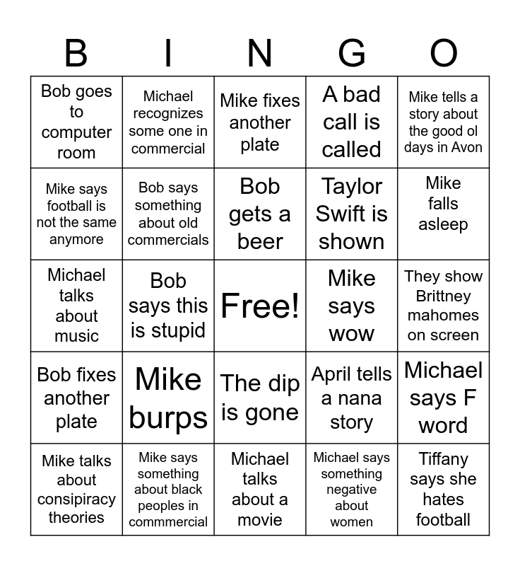 This bingo card has a free space and 24 words: Mike burps, Mike says something about black peoples in commmercial, Bob gets a beer, Mike talks about consipiracy theories, Mike tells a story about the good ol days in Avon, Bob goes to computer room, Mike says football is not the same anymore, Michael recognizes some one in commercial, Mike says wow, The dip is gone, Taylor Swift is shown, Michael talks about music, April tells a nana story, Michael says F word, Bob says something about old commercials, Michael says something negative about women, They show Brittney mahomes on screen, Mike fixes another plate, Mike falls asleep, Bob says this is stupid, Tiffany says she hates football, Bob fixes another plate, A bad call is called and Michael talks about a movie.