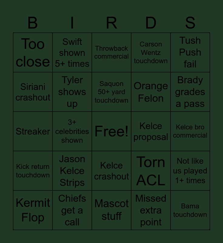 This bingo card has a free space and 24 words: Jason Kelce Strips, Chiefs get a call, Saquon 50+ yard touchdown, Kermit Flop, Tush Push fail, Too close, Siriani crashout, Swift shown 5+ times, Kelce proposal, Kelce crashout, Orange Felon, Streaker, Torn ACL, Not like us played 1+ times, Tyler shows up, Missed extra point, Kelce bro commercial, Throwback commercial, Brady grades a pass, 3+ celebrities shown, Bama touchdown, Kick return touchdown, Carson Wentz touchdown and Mascot stuff.