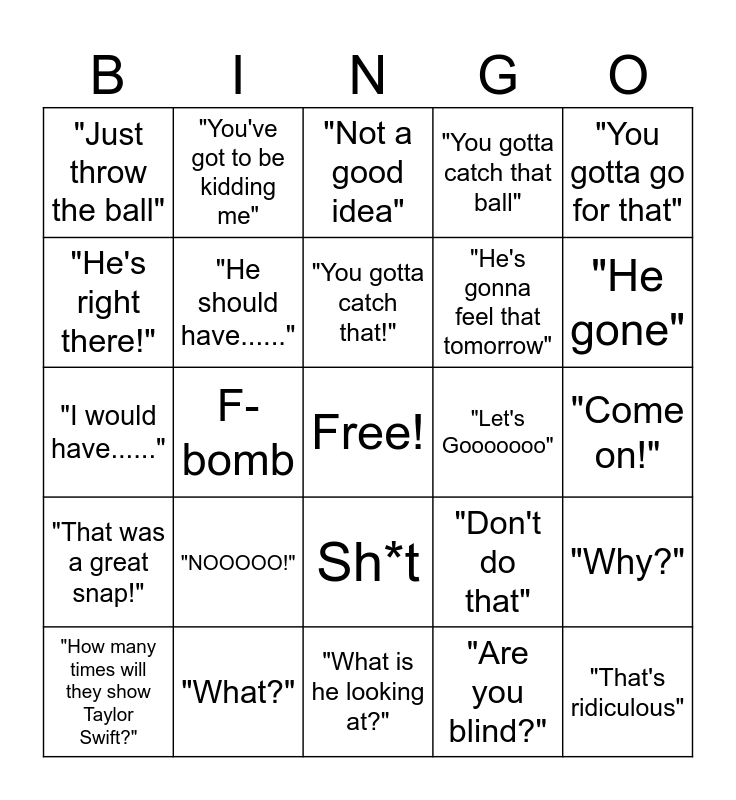 This bingo card has a free space and 24 words: "How many times will they show Taylor Swift?", "NOOOOO!", "You gotta catch that!", "Are you blind?", "You gotta go for that", "Just throw the ball", "You've got to be kidding me", "Not a good idea", "Let's Gooooooo", "Come on!", "I would have......", "He should have......", "Don't do that", "Why?", "He's right there!", "What?", "What is he looking at?", "You gotta catch that ball", "He gone", "That was a great snap!", F-bomb, Sh*t, "He's gonna feel that tomorrow" and "That's ridiculous".