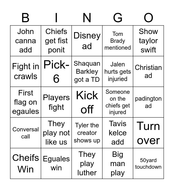 This bingo card has a free space and 24 words: They play not like us, Eguales win, Shaquan Barkley got a TD, Cheifs Win, Show taylor swift, John canna add, Fight in crawls, Chiefs get fist ponit, Someone on the chiefs get injured, Tyler the creator shows up, Jalen hurts gets injuried, First flag on egaules, Tavis kelce add, Turn over, Pick-6, Big man play, padington ad, Disney ad, Christian ad, Players fight, 50yard touchdown, Conversal call, Tom Brady mentioned and They play luther.