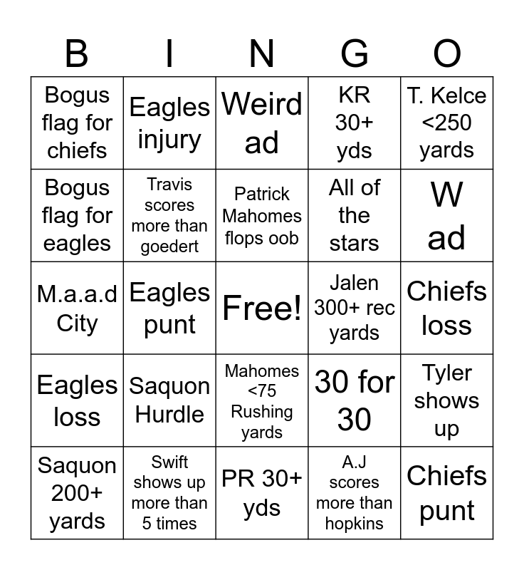This bingo card has a free space and 24 words: Saquon Hurdle, Swift shows up more than 5 times, Patrick Mahomes flops oob, Saquon 200+ yards, T. Kelce <250 yards, Bogus flag for chiefs, Bogus flag for eagles, Eagles injury, Jalen 300+ rec yards, Mahomes <75 Rushing yards, All of the stars, M.a.a.d City, 30 for 30, Tyler shows up, Travis scores more than goedert, A.J scores more than hopkins, Chiefs loss, Weird ad, W ad, Eagles punt, Chiefs punt, Eagles loss, KR 30+ yds and PR 30+ yds.