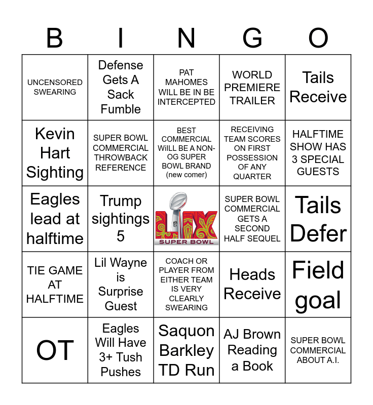 This bingo card has a free space and 28 words: Field goal, Punt returned for TD, RECEIVING TEAM SCORES ON FIRST POSSESSION OF ANY QUARTER, AJ Brown Reading a Book, Kevin Hart Sighting, PAT MAHOMES WILL BE IN BE INTERCEPTED, Defense Gets A Sack Fumble, TIE GAME AT HALFTIME, SUPER BOWL COMMERCIAL GETS A SECOND HALF SEQUEL, OT, Eagles lead at halftime, WORLD PREMIERE TRAILER, Eagles Will Have 3+ Tush Pushes, Saquon Barkley TD Run, HALFTIME SHOW HAS 3 SPECIAL GUESTS, SURPRISE HALFTIME ARTIST IS BETTER THAN KENDRICK, Lil Wayne is Surprise Guest, SUPER BOWL COMMERCIAL THROWBACK REFERENCE, BEST COMMERCIAL WiILL BE A NON-OG SUPER BOWL BRAND (new comer), COACH OR PLAYER FROM EITHER TEAM IS VERY CLEARLY SWEARING, UNCENSORED SWEARING, RETURN OF THE Clydesdales, SUPER BOWL COMMERCIAL ABOUT A.I., Trump sightings 5, Tails Defer, Heads Receive, Tails Receive and Reference Made To “lights going out during Beyonce’s Super Bowl appearance”.