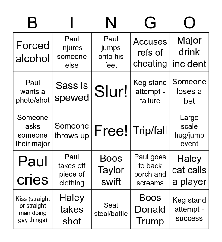 This bingo card has a free space and 24 words: Paul takes off piece of clothing, Haley takes shot, Slur!, Kiss (straight or straight man doing gay things), Major drink incident, Forced alcohol, Paul wants a photo/shot, Paul injures someone else, Trip/fall, Boos Taylor swift, Keg stand attempt - failure, Someone asks someone their major, Paul goes to back porch and screams, Haley cat calls a player, Sass is spewed, Boos Donald Trump, Large scale hug/jump event, Paul jumps onto his feet, Someone loses a bet, Someone throws up, Keg stand attempt - success, Paul cries, Accuses refs of cheating and Seat steal/battle.