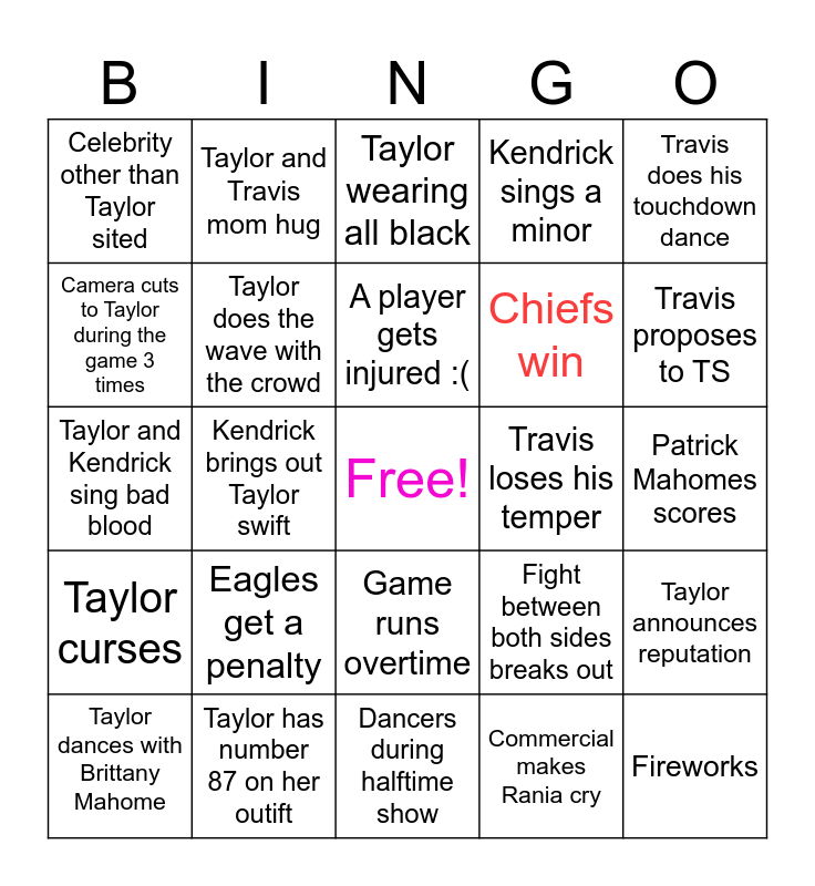 This bingo card has a free space and 24 words: Taylor dances with Brittany Mahome, Eagles get a penalty, A player gets injured :(, Commercial makes Rania cry, Travis does his touchdown dance, Celebrity other than Taylor sited, Taylor and Travis mom hug, Taylor wearing all black, Travis loses his temper, Patrick Mahomes scores, Taylor and Kendrick sing bad blood, Taylor does the wave with the crowd, Fight between both sides breaks out, Taylor announces reputation, Camera cuts to Taylor during the game 3 times, Taylor has number 87 on her outift, Dancers during halftime show, Kendrick sings a minor, Travis proposes to TS, Taylor curses, Kendrick brings out Taylor swift, Game runs overtime, Chiefs win and Fireworks.