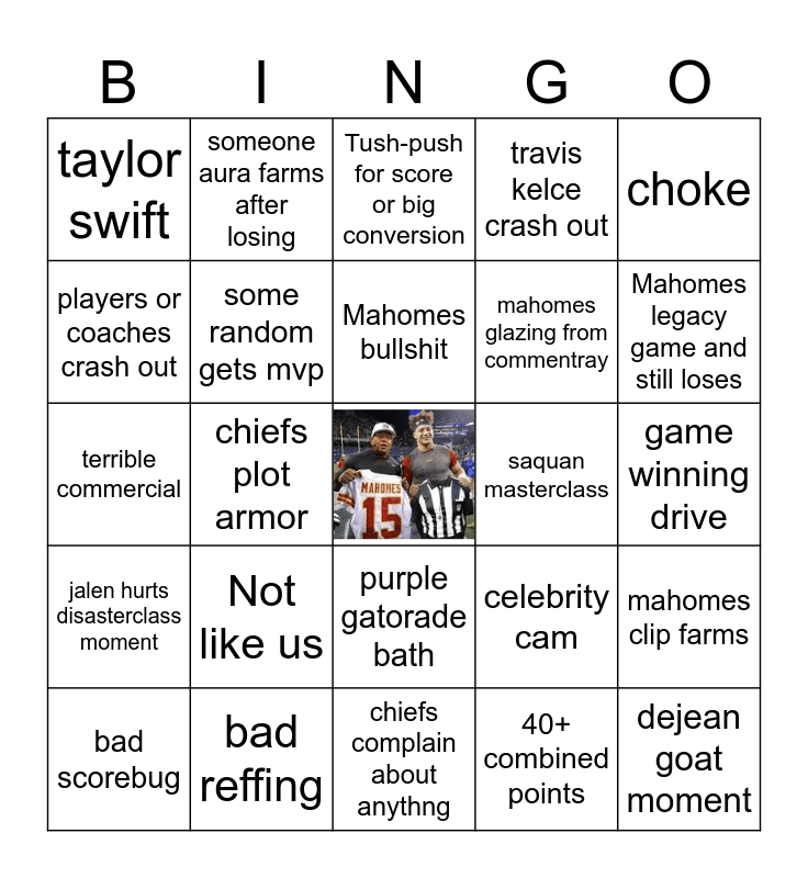 This bingo card has a free space and 24 words: Not like us, bad reffing, Mahomes bullshit, bad scorebug, choke, taylor swift, players or coaches crash out, someone aura farms after losing, saquan masterclass, purple gatorade bath, mahomes glazing from commentray, terrible commercial, celebrity cam, mahomes clip farms, some random gets mvp, 40+ combined points, game winning drive, Tush-push for score or big conversion, Mahomes legacy game and still loses, chiefs plot armor, dejean goat moment, jalen hurts disasterclass moment, travis kelce crash out and chiefs complain about anythng.