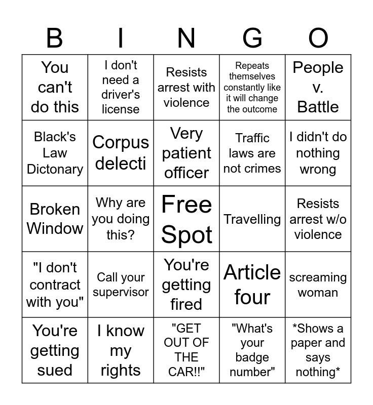 This bingo card has a free space and 24 words: Call your supervisor, I know my rights, Very patient officer, You're getting sued, People v. Battle, You can't do this, Black's Law Dictonary, I don't need a driver's license, Travelling, You're getting fired, Traffic laws are not crimes, Broken Window, Article four, screaming woman, Corpus delecti, "What's your badge number", Resists arrest w/o violence, Resists arrest with violence, I didn't do nothing wrong, Why are you doing this?, *Shows a paper and says nothing*, "I don't contract with you", Repeats themselves constantly like it will change the outcome and "GET OUT OF THE CAR!!".