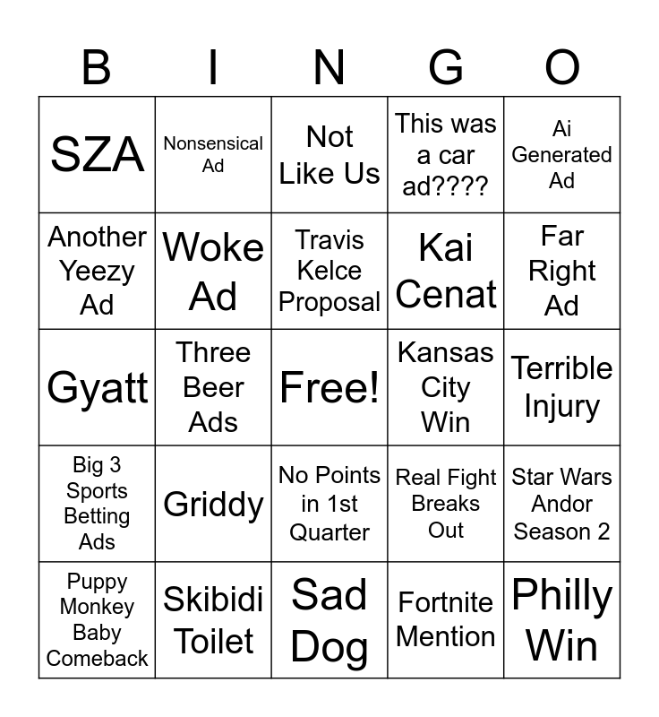 This bingo card has a free space and 24 words: Griddy, Skibidi Toilet, Travis Kelce Proposal, Puppy Monkey Baby Comeback, Ai Generated Ad, SZA, Another Yeezy Ad, Nonsensical Ad, Kansas City Win, No Points in 1st Quarter, Kai Cenat, Gyatt, Real Fight Breaks Out, Star Wars Andor Season 2, Woke Ad, Fortnite Mention, Terrible Injury, Not Like Us, Far Right Ad, Three Beer Ads, Philly Win, Big 3 Sports Betting Ads, This was a car ad???? and Sad Dog.