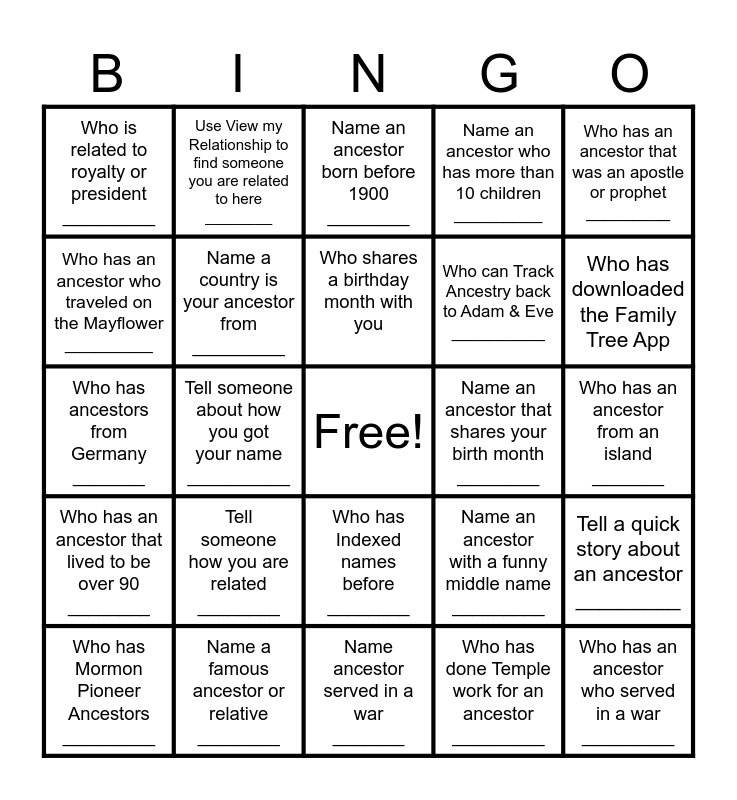 This bingo card has a free space and 24 words: Who has Mormon Pioneer Ancestors _________, Tell someone how you are related ________, Who shares a birthday month with you, Who has done Temple work for an ancestor _________, Who has an ancestor that was an apostle or prophet _________, Who is related to royalty or president _________, Use View my Relationship to find someone you are related to here ________, Name an ancestor born before 1900 ________, Name an ancestor that shares your birth month ________, Who has an ancestor from an island _______, Who has ancestors from Germany _______, Name a country is your ancestor from _________, Name an ancestor with a funny middle name _________, Tell a quick story about an ancestor _________, Who has an ancestor who traveled on the Mayflower _________, Name a famous ancestor or relative ________, Name ancestor served in a war _______, Name an ancestor who has more than 10 children _________, Who has downloaded the Family Tree App, Who has an ancestor that lived to be over 90 ________, Tell someone about how you got your name __________, Who has Indexed names before ________, Who can Track Ancestry back to Adam & Eve __________ and Who has an ancestor who served in a war _________.
