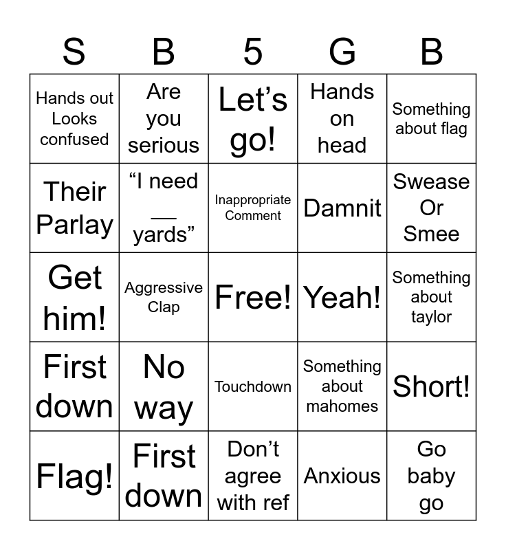 This bingo card has a free space and 24 words: No way, First down, Inappropriate Comment, Flag!, Something about flag, Hands out Looks confused, Their Parlay, Are you serious, Yeah!, Touchdown, Damnit, Get him!, Something about mahomes, Short!, “I need __ yards”, Anxious, Something about taylor, Let’s go!, Swease Or Smee, Aggressive Clap, Go baby go, First down, Hands on head and Don’t agree with ref.