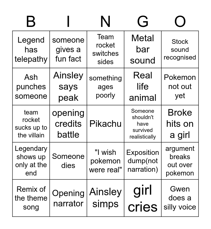 This bingo card has a free space and 29 words: Remix of the theme song, Ash is rude, opening credits battle, ash has super powers(for no reason), Legend has telepathy, Team rocket switches sides, Ainsley says peak, Someone dies, Someone shouldn't have survived realistically, Opening narrator, Broke hits on a girl, Gwen does a silly voice, Ainsley simps, girl cries, Pokemon not out yet, Will correctly guesses a pokemon, "I wish pokemon were real", Legendary shows up only at the end, Stock sound recognised, team rocket sucks up to the villain, Exposition dump(not narration), Gwen's late, Real life animal, Ash punches someone, Metal bar sound, someone gives a fun fact, argument breaks out over pokemon, something ages poorly and Animators lock in.