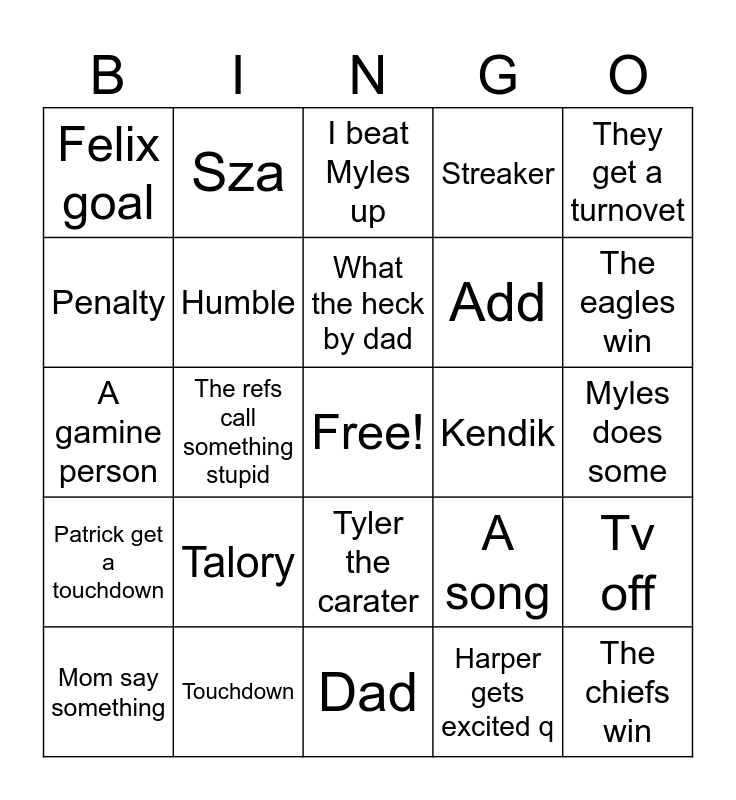This bingo card has a free space and 24 words: Talory, Touchdown, What the heck by dad, Mom say something, They get a turnovet, Felix goal, Penalty, Sza, Kendik, Tyler the carater, Add, A gamine person, A song, Tv off, Humble, Harper gets excited q, Myles does some, I beat Myles up, The eagles win, The refs call something stupid, The chiefs win, Patrick get a touchdown, Streaker and Dad.