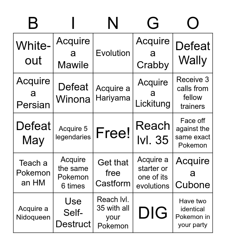 This bingo card has a free space and 30 words: Use Self-Destruct, Acquire a Regi, Acquire 5 legendaries, Acquire an Abra, White-out, Evolution, Defeat Winona, Get that free Castform, Reach lvl. 35, Reach lvl. 35 with all your Pokemon, Face off against the same exact Pokemon, Have two identical Pokemon in your party, DIG, Acquire 3 Regis, Receive 3 calls from fellow trainers, Fight in 4 double battles, Acquire a starter or one of its evolutions, Teach a Pokemon an HM, Acquire the same Pokemon 6 times, Defeat Wally, Defeat May, Defeat Liza and Tate, Acquire a Mawile, Acquire a Lickitung, Acquire a Persian, Acquire a Crabby, Acquire a Cubone, Acquire a Nidoqueen, Acquire a Hariyama and Acquire a Mankey.