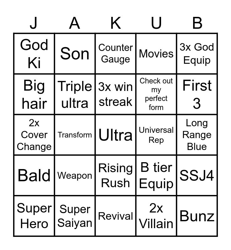 This bingo card has 45 words: Fusion, Ultra, AOE Green, Super Hero, Max Zenkai, 2x Villain, Counter Gauge, DB, 3x God Equip, Super Saiyan, Movies, Universal Rep, Rising Rush, Weapon, LF, Revival, Piccolo, 2x Cover Change, Cell saga, First 3, Son, Double Rush, Extreme, God Ki, Tag, Long Range Blue, Legends Fest 2025, Human, B tier Equip, Bald, DAIMA, SSJ4, Goku Look-Alike, Angry Unit, Android/ Robot, Transform, Future, blue colored unit, Bunz, 3x win streak, Big hair, Check out my perfect form, Lag, Triple ultra and Broly.