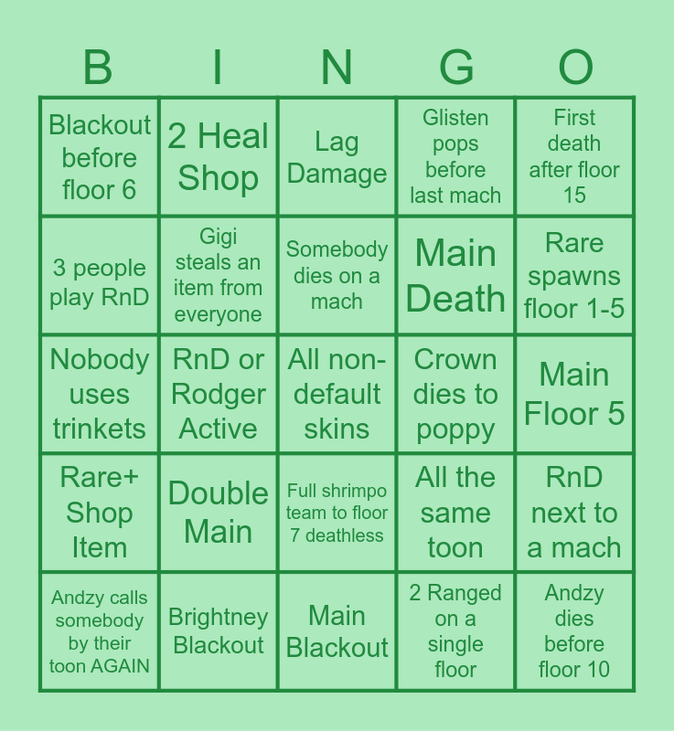 This bingo card has a free space and 24 words: Double Main, Brightney Blackout, Somebody dies on a mach, Andzy calls somebody by their toon AGAIN, First death after floor 15, Blackout before floor 6, 3 people play RnD, 2 Heal Shop, Crown dies to poppy, Full shrimpo team to floor 7 deathless, Main Death, Nobody uses trinkets, All the same toon, RnD next to a mach, Gigi steals an item from everyone, 2 Ranged on a single floor, Main Floor 5, Lag Damage, Rare spawns floor 1-5, RnD or Rodger Active, Andzy dies before floor 10, Rare+ Shop Item, Glisten pops before last mach and Main Blackout.