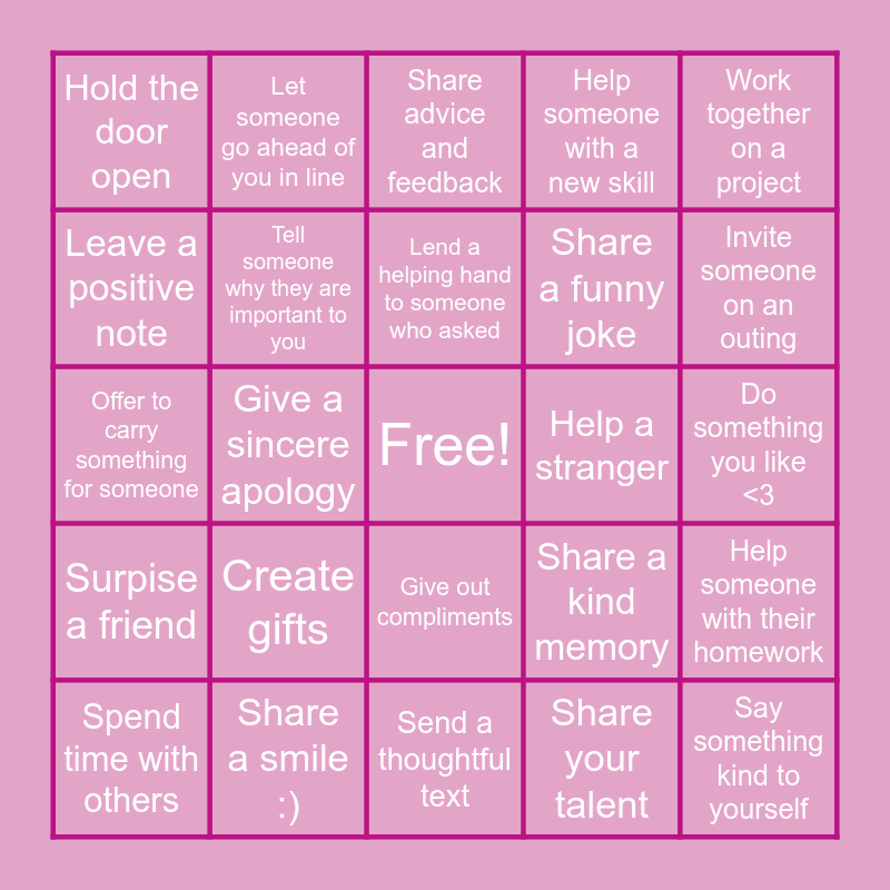 This bingo card has a free space and 24 words: Create gifts, Share a smile :), Lend a helping hand to someone who asked, Spend time with others, Work together on a project, Hold the door open, Leave a positive note, Let someone go ahead of you in line, Help a stranger, Give out compliments, Share a funny joke, Offer to carry something for someone, Share a kind memory, Help someone with their homework, Tell someone why they are important to you, Share your talent, Do something you like <3, Share advice and feedback, Invite someone on an outing, Give a sincere apology, Say something kind to yourself, Surpise a friend, Help someone with a new skill and Send a thoughtful text.