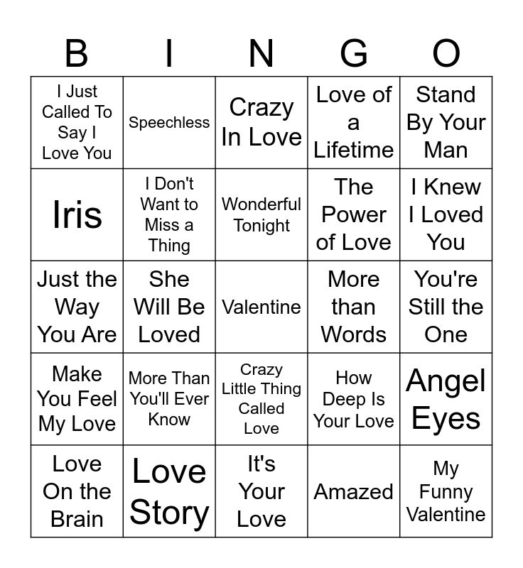 This bingo card has a free space and 50 words: Chances Are, My Funny Valentine, I Cross My Heart, It's Your Love, More Than You'll Ever Know, I Walk the Line, Speechless, I Swear, Iris, Can't Fight This Feeling, I Don't Want to Miss a Thing, Love of a Lifetime, Angel Eyes, How Deep Is Your Love, She's Everything, Faithfully, Wonderful Tonight, More than Words, I'll Stand By You, Stand By Your Man, She Will Be Loved, Amazed, I Just Called To Say I Love You, The Power of Love, Shameless, Can't Help Falling In Love, I Knew I Loved You, Truly Madly Deeply, Crazy In Love, Crazy Little Thing Called Love, Bleeding Love, I Will Always Love You, We Found Love, Endless Love, Love Story, When You Say Nothing At All, God Gave Me You, Think I'm In Love With You, Forever and Ever, Amen, You're Still the One, Bless the Broken Road, Adore You, Perfect, We Belong Together, Love On the Brain, Just the Way You Are, Tangled Up in You, Forever After All, Make You Feel My Love and I'd Love You All Over Again.