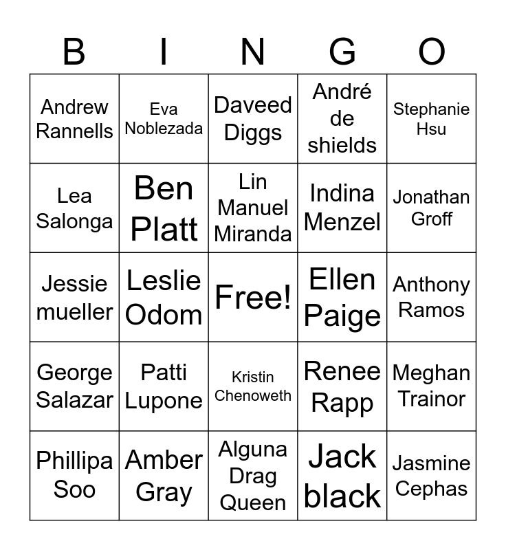 This bingo card has a free space and 24 words: Patti Lupone, Amber Gray, Lin Manuel Miranda, Phillipa Soo, Stephanie Hsu, Andrew Rannells, Lea Salonga, Eva Noblezada, Ellen Paige, Kristin Chenoweth, Indina Menzel, Jessie mueller, Renee Rapp, Meghan Trainor, Ben Platt, Jack black, Anthony Ramos, Daveed Diggs, Jonathan Groff, Leslie Odom, Jasmine Cephas, George Salazar, André de shields and Alguna Drag Queen.