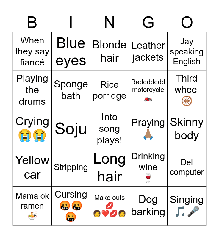 This bingo card has a free space and 24 words: Stripping, Cursing 🤬🤬🤬, Rice porridge, Mama ok ramen 🍜, Jay speaking English, When they say fiancé, Playing the drums, Blue eyes, Praying🙏🏽, Long hair, Reddddddd motorcycle🏍️, Crying😭😭, Drinking wine 🍷, Del computer, Sponge bath, Dog barking, Skinny body, Blonde hair, Third wheel 🛞, Soju, Singing 🎵🎤, Yellow car, Leather jackets and Make outs 💋🧑❤️💋🧑.