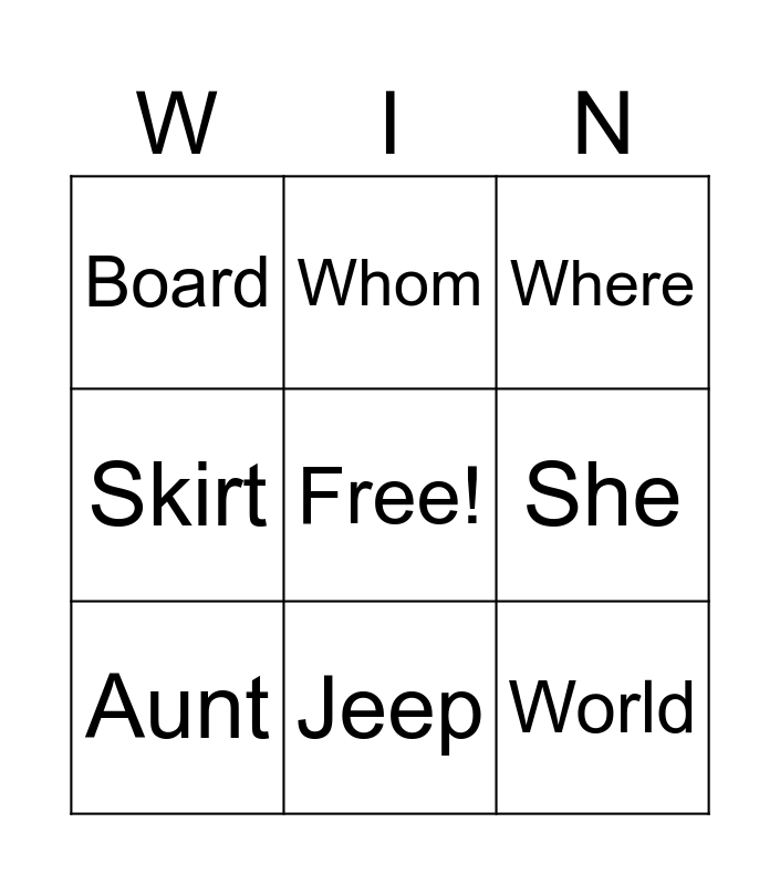 This bingo card has a free space and 8 words: She, Where, Whom, Aunt, Board, World, Skirt and Jeep.