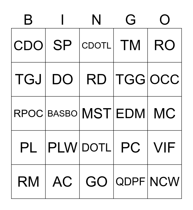 This bingo card has 30 words: AC, AT, BASBO, BOL, CDO, CDOTL, DO, DOTL, EDM, GO, MC, MST, QDPF, NCW, OCC, P&A, PC, PL, PLW, RO, RPOC, SAPP, SP, TGG, TGJ, TM, VIF, RM, RD and IHQ.