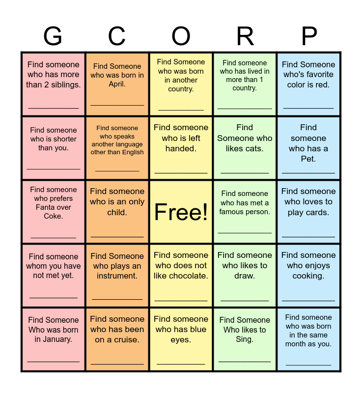 This bingo card has a free space and 25 words: Find Someone Who was born in January. ____________, Find Someone who plays an instrument. ___________, Find someone who is left handed. ___________, Find Someone Who likes to Sing. ____________, Find someone who has a Pet. ___________, Find someone who has more than 2 siblings. ___________, Find Someone who was born in April. _____________, Find Someone who was born in another country. ___________, Find Someone who likes cats. __________, Find someone who enjoys cooking. ___________, Find someone who prefers Fanta over Coke. ___________, Find someone who speaks another language other than English ____________, Find someone who likes to draw. __________, Find someone who was born in the same month as you. ___________, Find someone who is shorter than you. _____________, Find someone who has been on a cruise. ___________, Find someone who has blue eyes. __________, Find someone who has lived in more than 1 country. ______________, Find someone who loves to play cards. ___________, Find someone whom you have not met yet. ___________, Find someone who is an only child. ___________, Find someone who does not like chocolate. ___________, Find someone who has met a famous person. _____________, Find Someone who's favorite color is red. ___________ and Find someone who is wearing a blue shirt. ____________.