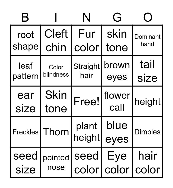 This bingo card has a free space and 32 words: Eye color, Hair color and texture, Skin tone, Blood type, Freckles, Color blindness, Dominant hand, Dimples, Cleft chin, Curly hair, Straight hair, Fur color, Body pattern, Short tail, flower call, petal shape, seed size, ear size, plant height, Thorn, blue eyes, green eyes, height, pointed nose, hair color, skin tone, brown eyes, leaf pattern, root shape, seed color, seed shape and tail size.