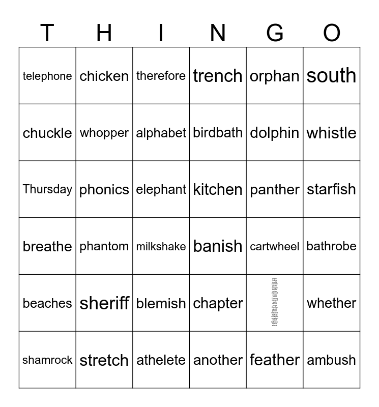This bingo card has 37 words: chapter feather chuckle phantom panther whopper another orphan shamrock whistle trench Thursday elephant south kitchen sheriff therefore starfish phonics telephone birdbath milkshake cartwheel stretch bathrobec chicken athelete, chapter, feather, chuckle, phantom, panther, whopper, another, orphan, shamrock, whistle, trench, Thursday, elephant, south, kitchen, sheriff, therefore, starfish, phonics, telephone, birdbath, milkshake, cartwheel, stretch, bathrobe, chicken, athelete, whether, blemish, thimble, banish, dolphin, beaches, breathe, alphabet and ambush.