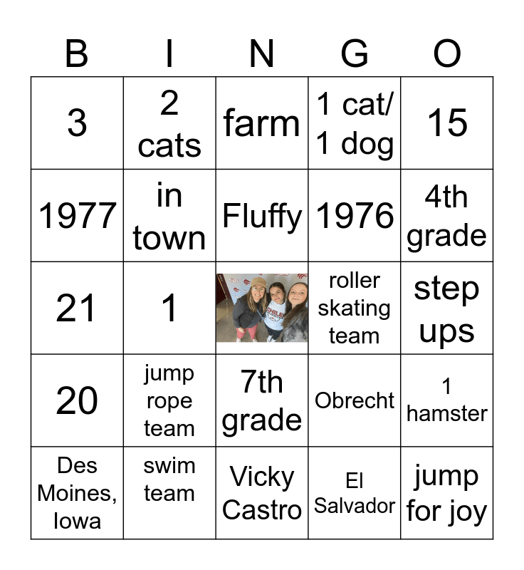 This bingo card has a free space and 29 words: Des Moines, Iowa, Springfield, Illinois, 1, 2, 3, farm, in town, jump rope team, roller skating team, swim team, step ups, jump for joy, Vicky Castro, El Salvador, 4th grade, 6th grade, 7th grade, 20, 15, 21, Obrecht, Martin, 1976, 1977, 1 cat/ 1 dog, 2 cats, 1 hamster, Fluffy and Beau.