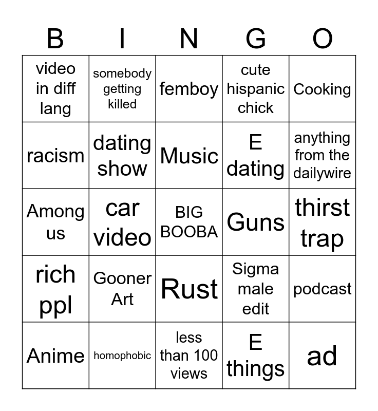 This bingo card has a free space and 25 words: Gooner Art, less than 100 views, Music, Anime, Cooking, video in diff lang, racism, somebody getting killed, Guns, Rust, E dating, Among us, Sigma male edit, podcast, dating show, game dev, thirst trap, femboy, anything from the dailywire, car video, ad, homophobic, rich ppl, cute hispanic chick and E things.