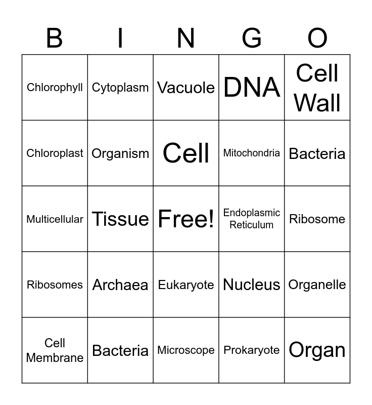 This bingo card has a free space and 24 words: Archaea, Bacteria, Cell, Cell Membrane, Cell Wall, Chlorophyll, Chloroplast, Cytoplasm, Endoplasmic Reticulum, Eukaryote, Mitochondria, Multicellular, Nucleus, Organelle, Organism, Prokaryote, Ribosome, Vacuole, Bacteria, Tissue, Organ, Ribosomes, DNA and Microscope.