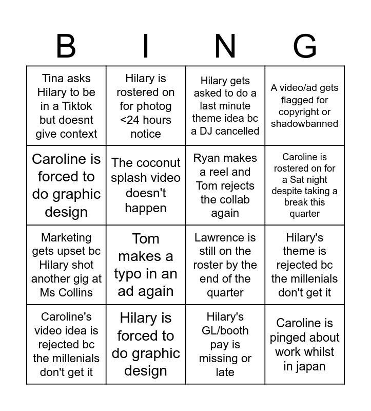 This bingo card has 16 words: Hilary is forced to do graphic design, Hilary's theme is rejected bc the millenials don't get it, Hilary gets asked to do a last minute theme idea bc a DJ cancelled, Tina asks Hilary to be in a Tiktok but doesnt give context, Marketing gets upset bc Hilary shot another gig at Ms Collins, Hilary is rostered on for photog <24 hours notice, Lawrence is still on the roster by the end of the quarter, Hilary's GL/booth pay is missing or late, Caroline is forced to do graphic design, The coconut splash video doesn't happen, Caroline's video idea is rejected bc the millenials don't get it, A video/ad gets flagged for copyright or shadowbanned, Tom makes a typo in an ad again, Caroline is rostered on for a Sat night despite taking a break this quarter, Ryan makes a reel and Tom rejects the collab again and Caroline is pinged about work whilst in japan.