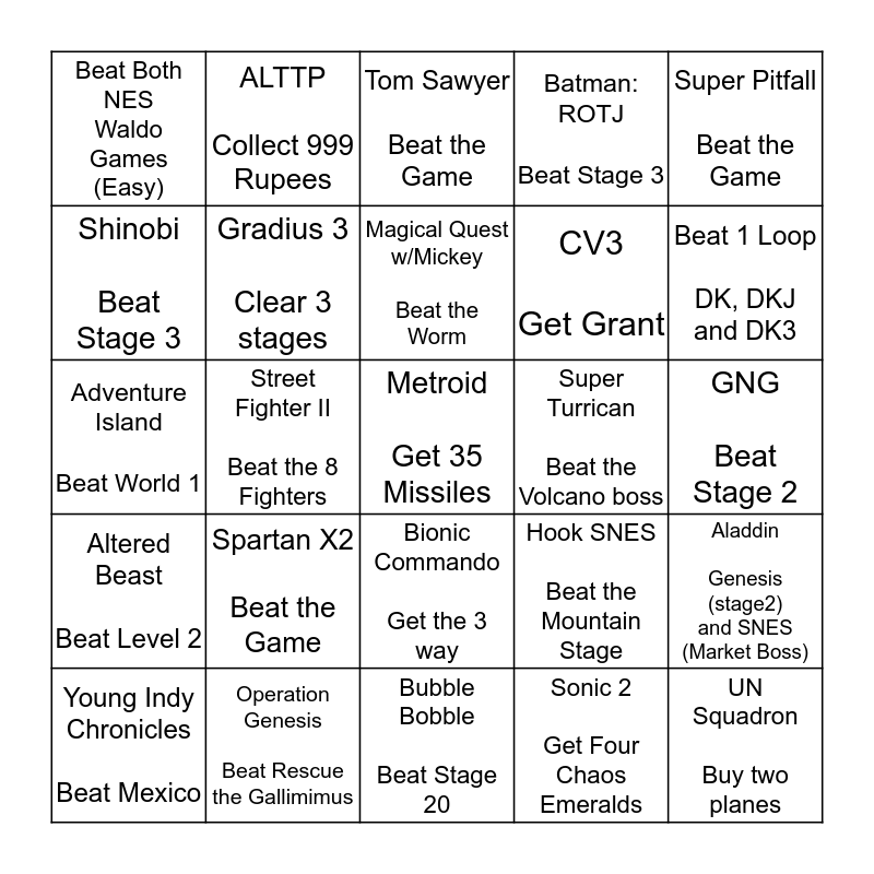 This bingo card has a free space and 24 words: Spartan X2 Beat the Game, Operation Genesis Beat Rescue the Gallimimus, Magical Quest w/Mickey Beat the Worm, Young Indy Chronicles Beat Mexico, Super Pitfall Beat the Game, Beat Both NES Waldo Games (Easy), Shinobi Beat Stage 3, ALTTP Collect 999 Rupees, Super Turrican Beat the Volcano boss, Bionic Commando Get the 3 way, CV3 Get Grant, Adventure Island Beat World 1, Hook SNES Beat the Mountain Stage, Aladdin Genesis (stage2) and SNES (Market Boss), Gradius 3 Clear 3 stages, Sonic 2 Get Four Chaos Emeralds, GNG Beat Stage 2, Tom Sawyer Beat the Game, Beat 1 Loop DK, DKJ and DK3, Street Fighter II Beat the 8 Fighters, UN Squadron Buy two planes, Altered Beast Beat Level 2, Batman: ROTJ Beat Stage 3 and Bubble Bobble Beat Stage 20.