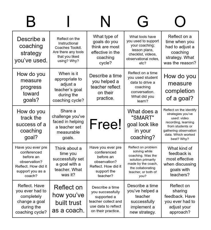 This bingo card has a free space and 24 words: Think about a time you successfully set a goal with a teacher. What was it?, Reflect on how you’ve built trust as a coach., Describe a time you helped a teacher reflect on their practice., Reflect. Have you ever had to completely change a goal during the coaching cycle?, Reflect on a time when you had to adjust a coaching strategy. What was the reason?, Describe a coaching strategy you’ve used., How do you measure progress toward goals?, Reflect on the Instructional Coaches Toolkit. Are there any tools that you liked using? Why?, What does a "SMART" goal look like in your coaching?, Have you ever pre conferenced before an observation? Reflect. How did it support the teacher?, Reflect on a time you used student data to drive a coaching conversation. What did you learn?, How do you track the success of a coaching goal?, Reflect on problem solving while coaching. Was the solution primarily made by the coach, the collaborating teacher, or both of you?, What kind of feedback is most effective when discussing goals with teachers?, When is it appropriate to adjust a teacher’s goal during the coaching cycle?, Describe a time you’ve helped a teacher successfully implement a new strategy., Reflect on the identify strategies you’ve used: video recording, learning from students or gathering observation data. Which worked best? Why?, What type of goals do you think are most effective in the coaching cycle?, How do you measure completion of a goal?, Share a challenge you've faced in helping a teacher set measurable goals., Reflect on sharing feedback. Have you ever had to adjust your approach?, Have you ever pre conferenced before an observation? Reflect. How did it support you as a coach?, What tools have you used to support your coaching; lesson plans, checklist, videos, observational notes, etc? and Describe a time you successfully supported a teacher collect and use data to reflect on their practice..