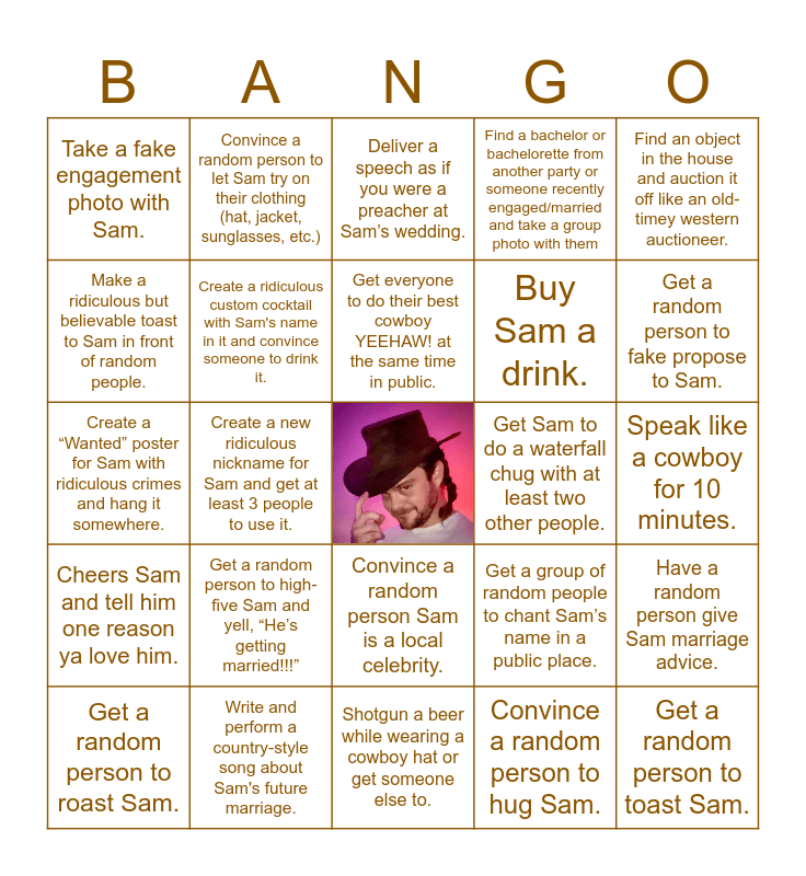 This bingo card has a free space and 24 words: Get a random person to high-five Sam and yell, “He’s getting married!!!”, Write and perform a country-style song about Sam's future marriage., Get everyone to do their best cowboy YEEHAW! at the same time in public., Get a random person to roast Sam., Find an object in the house and auction it off like an old-timey western auctioneer., Take a fake engagement photo with Sam., Make a ridiculous but believable toast to Sam in front of random people., Convince a random person to let Sam try on their clothing (hat, jacket, sunglasses, etc.), Get Sam to do a waterfall chug with at least two other people., Convince a random person Sam is a local celebrity., Buy Sam a drink., Create a “Wanted” poster for Sam with ridiculous crimes and hang it somewhere., Get a group of random people to chant Sam’s name in a public place., Have a random person give Sam marriage advice., Create a ridiculous custom cocktail with Sam's name in it and convince someone to drink it., Convince a random person to hug Sam., Speak like a cowboy for 10 minutes., Deliver a speech as if you were a preacher at Sam’s wedding., Get a random person to fake propose to Sam., Create a new ridiculous nickname for Sam and get at least 3 people to use it., Get a random person to toast Sam., Cheers Sam and tell him one reason ya love him., Find a bachelor or bachelorette from another party or someone recently engaged/married and take a group photo with them and Shotgun a beer while wearing a cowboy hat or get someone else to..