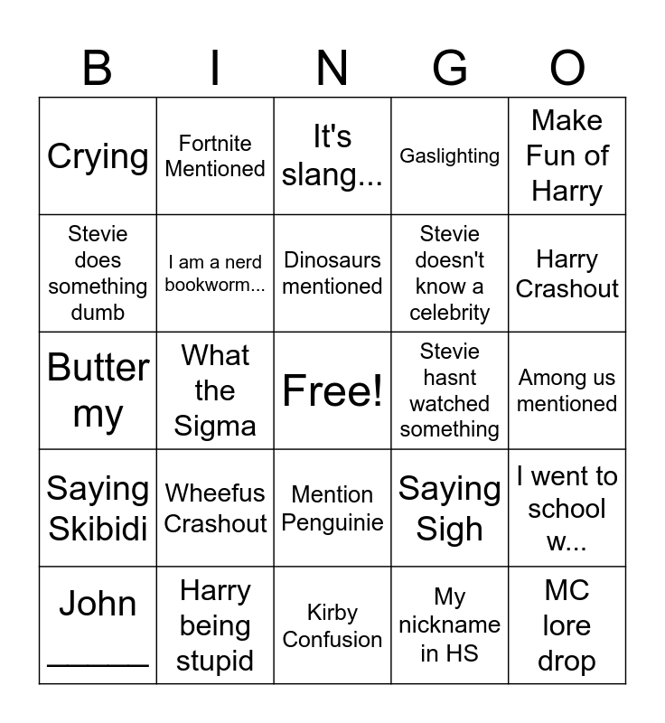 This bingo card has a free space and 39 words: Brainrot Rant, Anime Voice, Low Taper Fade, I am a nerd bookworm..., John _____, Mention Penguinie, Dinosaurs mentioned, Lag blamed, Make Fun of Harry, Saying Skibidi, What the Sigma, Gaslighting, MC lore drop, Among us mentioned, Stevie hasnt watched something, Wheefus Crashout, Meowing, Crying, General disappointment, Saying Sigh, Stevie does something dumb, Kirby Confusion, Stevie doesn't know a celebrity, Harry Crashout, Getting Scared, Southern Accent, Making fun of Alph, I hardly know her, Wheefus misses a joke, Fortnite Mentioned, Stevie zones out, Joke makes 0 sense.., It's slang..., Harry being stupid, My nickname in HS, Spongebob reference, I went to school w..., Butter my and Overconfidence.