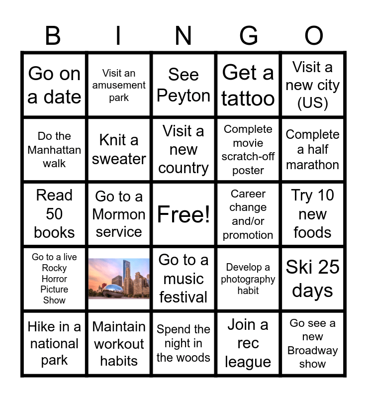 This bingo card has 1 images, a free space and 23 words: Maintain workout habits, Visit a new country, Hike in a national park, Visit a new city (US), Go on a date, Do the Manhattan walk, Visit an amusement park, Career change and/or promotion, Go to a music festival, Complete movie scratch-off poster, Read 50 books, Develop a photography habit, Ski 25 days, Knit a sweater, Join a rec league, Try 10 new foods, See Peyton, Complete a half marathon, Go to a Mormon service, Go see a new Broadway show, Go to a live Rocky Horror Picture Show, Get a tattoo and Spend the night in the woods.