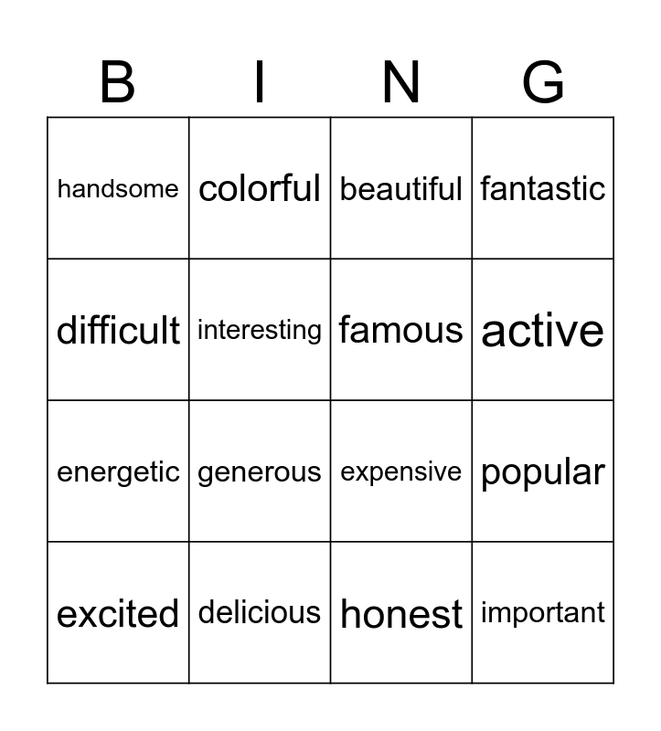 This bingo card has 16 words: delicious, popular, beautiful, handsome, energetic, colorful, expensive, honest, difficult, interesting, excited, fantastic, generous, active, famous and important.