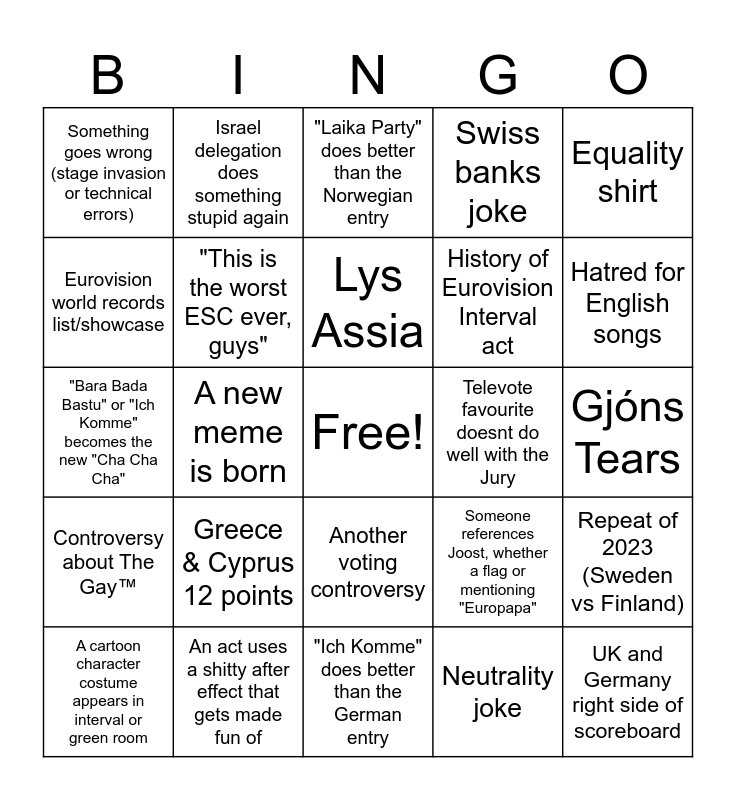 This bingo card has a free space and 24 words: Greece & Cyprus 12 points, An act uses a shitty after effect that gets made fun of, Lys Assia, A cartoon character costume appears in interval or green room, Equality shirt, Something goes wrong (stage invasion or technical errors), Eurovision world records list/showcase, Israel delegation does something stupid again, Televote favourite doesnt do well with the Jury, Another voting controversy, History of Eurovision Interval act, "Bara Bada Bastu" or "Ich Komme" becomes the new "Cha Cha Cha", Someone references Joost, whether a flag or mentioning "Europapa", Repeat of 2023 (Sweden vs Finland), "This is the worst ESC ever, guys", Neutrality joke, Gjóns Tears, "Laika Party" does better than the Norwegian entry, Hatred for English songs, A new meme is born, UK and Germany right side of scoreboard, Controversy about The Gay™, Swiss banks joke and "Ich Komme" does better than the German entry.