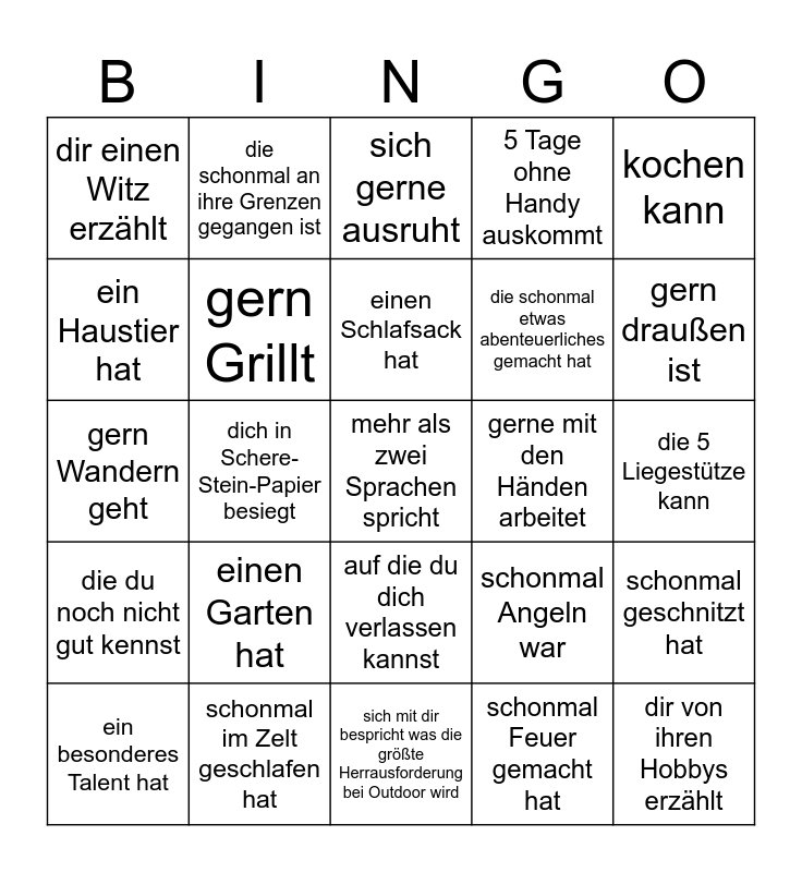 This bingo card has a free space and 24 words: einen Garten hat, schonmal im Zelt geschlafen hat, einen Schlafsack hat, ein besonderes Talent hat, kochen kann, dir einen Witz erzählt, ein Haustier hat, die schonmal an ihre Grenzen gegangen ist, gerne mit den Händen arbeitet, auf die du dich verlassen kannst, die schonmal etwas abenteuerliches gemacht hat, gern Wandern geht, schonmal Angeln war, schonmal geschnitzt hat, gern Grillt, schonmal Feuer gemacht hat, die 5 Liegestütze kann, sich gerne ausruht, gern draußen ist, dich in Schere-Stein-Papier besiegt, dir von ihren Hobbys erzählt, die du noch nicht gut kennst, 5 Tage ohne Handy auskommt and sich mit dir bespricht was die größte Herrausforderung bei Outdoor wird.