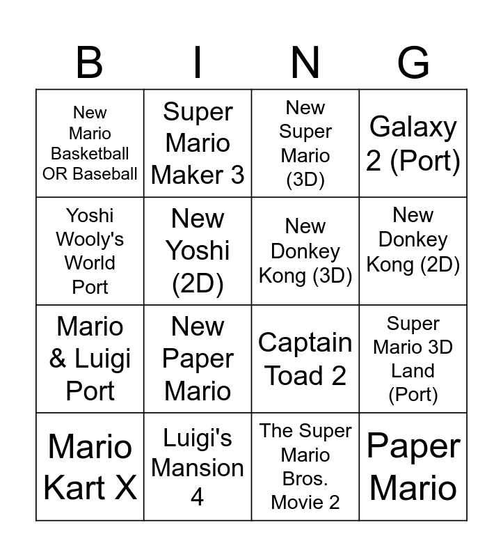 This bingo card has 17 words: The Super Mario Bros. Movie 2, Mario Kart X, New Super Mario (3D), New Mario Basketball OR Baseball, New Paper Mario, Galaxy 2 (Port), Super Mario 3D Land (Port), New Donkey Kong (3D), New Donkey Kong (2D), New Yoshi (2D), Luigi's Mansion 4, Captain Toad 2, Yoshi Wooly's World Port, Super Mario Maker 3, Mario & Luigi Port, Mario Paint and Paper Mario.