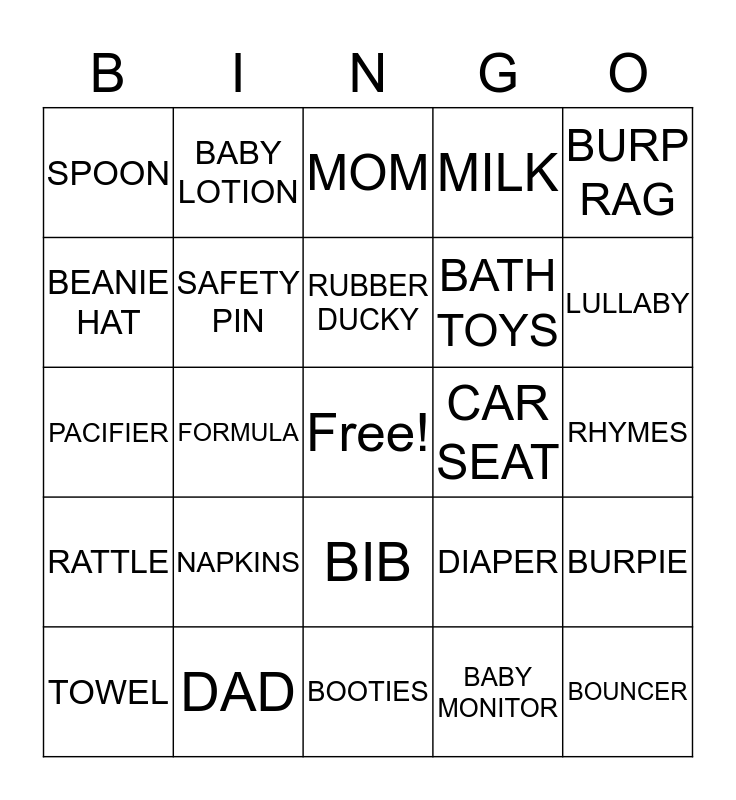 This bingo card has a free space and 24 words: NAPKINS, DAD, RUBBER DUCKY, TOWEL, BURP RAG, SPOON, BEANIE HAT, BABY LOTION, CAR SEAT, BIB, BATH TOYS, PACIFIER, DIAPER, BURPIE, SAFETY PIN, BABY MONITOR, RHYMES, MOM, LULLABY, FORMULA, BOUNCER, RATTLE, MILK and BOOTIES.