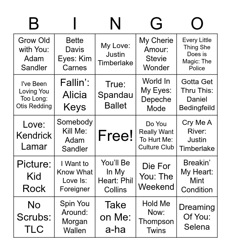 This bingo card has a free space and 51 words: I’ll Make You Love Me: Boyz II Men, Dreaming Of You: Selena, Open Arms: Journey, Take on Me: a-ha, I Want to Know What Love Is: Foreigner, I Will Always Love You Whitney Houston, Bette Davis Eyes: Kim Carnes, Earned It: The Weekend, I've Been Loving You Too Long: Otis Redding, Mine: Bazzi, Fallin’: Alicia Keys, My Cherie Amour: Stevie Wonder, Breakin’ My Heart: Mint Condition, Die For You: The Weekend, Love On The Brain: Rihanna, Bad Habit: Steve Lacy, True: Spandau Ballet, Do You Really Want To Hurt Me: Culture Club, China Girl: David Bowie, Every Little Thing She Does is Magic: The Police, Somebody Kill Me: Adam Sandler, Hold Me Now: Thompson Twins, Grow Old with You: Adam Sandler, World In My Eyes: Depeche Mode, The Promise: When In Rome, I’m with You: Avril Lavigne, Gotta Get Thru This: Daniel Bedingfeild, P.Y.T: Michael Jackson, No Scrubs: TLC, My Love: Justin Timberlake, Unfoolish: Ashanti, Love Like This: Faith Evans, Tennessee Whiskey: Chris Stapleton, Deeper Than the Holler: Randy Travis, Head Over Boots: Jon Pardi, Spin You Around: Morgan Wallen, Play It Again: Luke Bryan, Potential Breakup Song: Aly & AJ, I Hate Everything About You: Three Days Grace, I Hate Myself For Loving You: Joan Jett, Cry Me A River: Justin Timberlake, Picture: Kid Rock, I Hate U: SZA, Before He Cheats: Carrie Underwood, Luxurious: Gwen Stefani, Bad Romance: Lady Gaga, Love: Kendrick Lamar, Sold: John Michael Montgomery, Our Song: Taylor Swift, You’ll Be In My Heart: Phil Collins and Take Me to Church: Hozier.