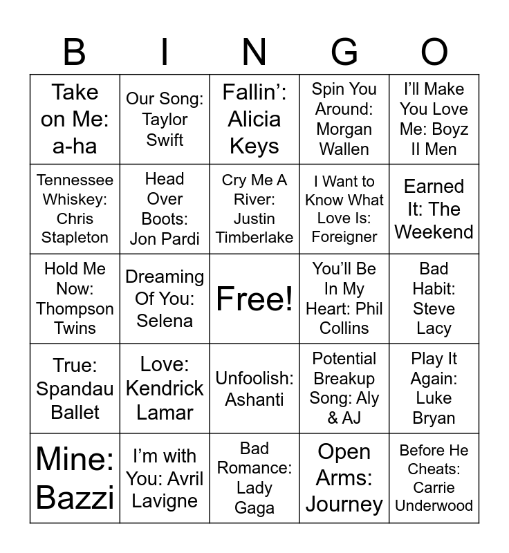 This bingo card has a free space and 51 words: I Hate U: SZA, Before He Cheats: Carrie Underwood, Luxurious: Gwen Stefani, Bad Romance: Lady Gaga, Love: Kendrick Lamar, Sold: John Michael Montgomery, Our Song: Taylor Swift, Love Like This: Faith Evans, Tennessee Whiskey: Chris Stapleton, Deeper Than the Holler: Randy Travis, Head Over Boots: Jon Pardi, Spin You Around: Morgan Wallen, Play It Again: Luke Bryan, Potential Breakup Song: Aly & AJ, I Hate Everything About You: Three Days Grace, I Hate Myself For Loving You: Joan Jett, Cry Me A River: Justin Timberlake, You’ll Be In My Heart: Phil Collins, Take Me to Church: Hozier, I’ll Make You Love Me: Boyz II Men, Dreaming Of You: Selena, Open Arms: Journey, Take on Me: a-ha, I Want to Know What Love Is: Foreigner, I Will Always Love You Whitney Houston, Bette Davis Eyes: Kim Carnes, Earned It: The Weekend, I've Been Loving You Too Long: Otis Redding, Mine: Bazzi, Fallin’: Alicia Keys, My Cherie Amour: Stevie Wonder, Breakin’ My Heart: Mint Condition, Grow Old with You: Adam Sandler, World In My Eyes: Depeche Mode, The Promise: When In Rome, I’m with You: Avril Lavigne, Gotta Get Thru This: Daniel Bedingfield, P.Y.T: Michael Jackson, Die For You: The Weekend, Love On The Brain: Rihanna, Bad Habit: Steve Lacy, True: Spandau Ballet, Do You Really Want To Hurt Me: Culture Club, China Girl: David Bowie, Every Little Thing She Does is Magic: The Police, Somebody Kill Me: Adam Sandler, Hold Me Now: Thompson Twins, No Scrubs: TLC, My Love: Justin Timberlake, Unfoolish: Ashanti and Picture: Kid Rock.