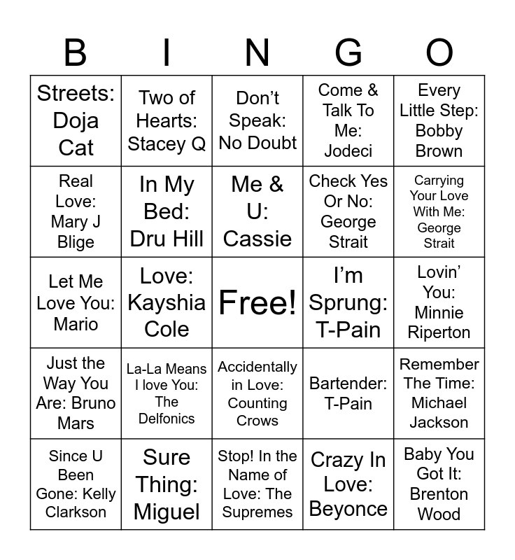 This bingo card has a free space and 51 words: Computer Love: Zapp, Baby You Got It: Brenton Wood, I Like the Way You Love Me: Brenton Wood, Stop! In the Name of Love: The Supremes, La-La Means I love You: The Delfonics, I’m Your Puppet: James & Bobby Purify, Two of Hearts: Stacey Q, She’s A Bad Mama Jama: Carl Carlton, Real Love: Mary J Blige, Knockin’ da Boots: H-Town, In My Bed: Dru Hill, Come & Talk To Me: Jodeci, Remember The Time: Michael Jackson, Bartender: T-Pain, Foolish: Ashanti, Are You That Somebody: Aaliyah, Me & U: Cassie, I’m Sprung: T-Pain, Buy U a Drank: T-Pain, Every Little Step: Bobby Brown, Love: Kayshia Cole, Crazy In Love: Beyonce, Streets: Doja Cat, Check Yes Or No: George Strait, Forever & Ever, Amen: Randy Travis, Just To See You Smile: Tim McGraw, Carrying Your Love With Me: George Strait, Ex-Girlfriend: No Doubt, Since U Been Gone: Kelly Clarkson, Don’t Speak: No Doubt, Casual: Chappell Roan, Pictures of You: The Cure, Better Now: Post Malone, Hit Em Up Style: Blu Cantrell, Need to Know: Doja Cat, Sure Thing: Miguel, Na Na: Trey Songz, I Will Survive: Gloria Gaynor, You’re Still The One: Shania Twain, L-O-V-E: Nat King Cole, Lovin’ You: Minnie Riperton, Just the Way You Are: Bruno Mars, This Love: Maroon 5, Complicated: Avril Lavigne, My Boo: Usher, No One: Alicia Keys, Let Me Love You: Mario, Yellow: Coldplay, Cruel to Be Kind: Letters To Cleo, Accidentally in Love: Counting Crows and Let’s Stay Together: Al Green.