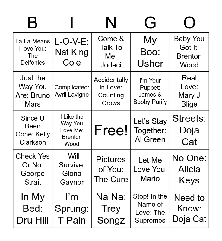 This bingo card has a free space and 51 words: Hit Em Up Style: Blu Cantrell, Need to Know: Doja Cat, Sure Thing: Miguel, Na Na: Trey Songz, I Will Survive: Gloria Gaynor, You’re Still The One: Shania Twain, L-O-V-E: Nat King Cole, Lovin’ You: Minnie Riperton, Just the Way You Are: Bruno Mars, This Love: Maroon 5, Complicated: Avril Lavigne, My Boo: Usher, No One: Alicia Keys, Let Me Love You: Mario, Yellow: Coldplay, Cruel to Be Kind: Letters To Cleo, Accidentally in Love: Counting Crows, Let’s Stay Together: Al Green, Computer Love: Zapp, Baby You Got It: Brenton Wood, I Like the Way You Love Me: Brenton Wood, Stop! In the Name of Love: The Supremes, La-La Means I love You: The Delfonics, I’m Your Puppet: James & Bobby Purify, Two of Hearts: Stacey Q, She’s A Bad Mama Jama: Carl Carlton, Real Love: Mary J Blige, Knockin’ da Boots: H-Town, In My Bed: Dru Hill, Come & Talk To Me: Jodeci, Remember The Time: Michael Jackson, Bartender: T-Pain, Foolish: Ashanti, Are You That Somebody: Aaliyah, Me & U: Cassie, I’m Sprung: T-Pain, Buy U a Drank: T-Pain, Every Little Step: Bobby Brown, Love: Kayshia Cole, Crazy In Love: Beyonce, Streets: Doja Cat, Check Yes Or No: George Strait, Forever & Ever, Amen: Randy Travis, Just To See You Smile: Tim McGraw, Carrying Your Love With Me: George Strait, Ex-Girlfriend: No Doubt, Since U Been Gone: Kelly Clarkson, Don’t Speak: No Doubt, Casual: Chappell Roan, Pictures of You: The Cure and Better Now: Post Malone.