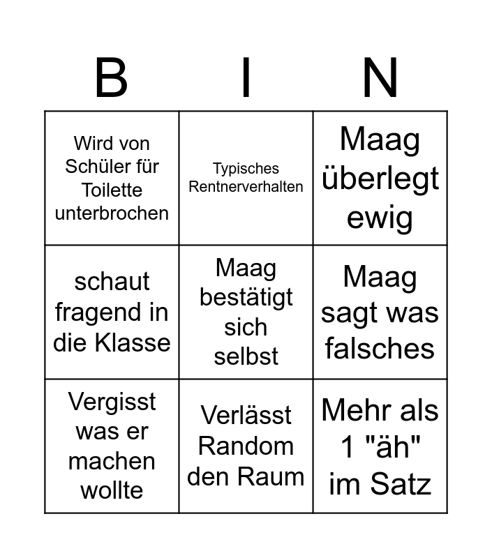This bingo card has a free space and 8 words: Maag sagt was falsches, Maag überlegt ewig, Typisches Rentnerverhalten, Vergisst was er machen wollte, Wird von Schüler für Toilette unterbrochen, Mehr als 1 "äh" im Satz, schaut fragend in die Klasse and Verlässt Random den Raum.