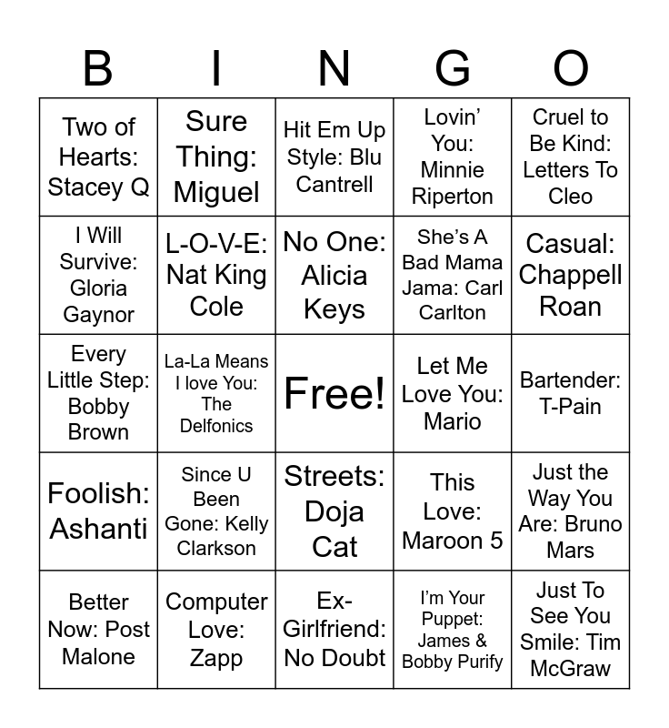This bingo card has a free space and 51 words: Forever & Ever, Amen: Randy Travis, Just To See You Smile: Tim McGraw, Carrying Your Love With Me: George Strait, Ex-Girlfriend: No Doubt, Since U Been Gone: Kelly Clarkson, Need to Know: Doja Cat, Sure Thing: Miguel, Na Na: Trey Songz, I Will Survive: Gloria Gaynor, You’re Still The One: Shania Twain, L-O-V-E: Nat King Cole, Lovin’ You: Minnie Riperton, Just the Way You Are: Bruno Mars, This Love: Maroon 5, Complicated: Avril Lavigne, My Boo: Usher, No One: Alicia Keys, Let Me Love You: Mario, Yellow: Coldplay, Cruel to Be Kind: Letters To Cleo, La-La Means I love You: The Delfonics, I’m Your Puppet: James & Bobby Purify, Two of Hearts: Stacey Q, She’s A Bad Mama Jama: Carl Carlton, Real Love: Mary J Blige, Don’t Speak: No Doubt, Casual: Chappell Roan, Pictures of You: The Cure, Better Now: Post Malone, Hit Em Up Style: Blu Cantrell, Knockin’ da Boots: H-Town, In My Bed: Dru Hill, Come & Talk To Me: Jodeci, Accidentally in Love: Counting Crows, Let’s Stay Together: Al Green, Computer Love: Zapp, Baby You Got It: Brenton Wood, I Like the Way You Love Me: Brenton Wood, Stop! In the Name of Love: The Supremes, Remember The Time: Michael Jackson, Bartender: T-Pain, Foolish: Ashanti, Are You That Somebody: Aaliyah, Me & U: Cassie, I’m Sprung: T-Pain, Buy U a Drank: T-Pain, Every Little Step: Bobby Brown, Love: Kayshia Cole, Crazy In Love: Beyonce, Streets: Doja Cat and Check Yes Or No: George Strait.