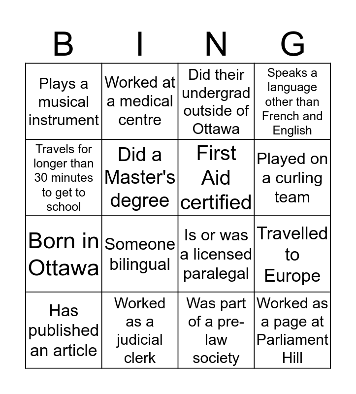 This bingo card has a free space and 15 words: Has published an article, Worked as a page at Parliament Hill, Did their undergrad outside of Ottawa, Plays a musical instrument, Played on a curling team, Travels for longer than 30 minutes to get to school, Someone bilingual, Was part of a pre-law society, Did a Master's degree, Born in Ottawa, Travelled to Europe, Speaks a language other than French and English, First Aid certified, Worked at a medical centre and Worked as a judicial clerk.