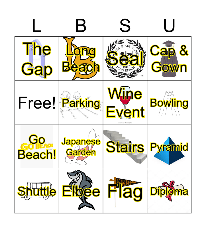 This bingo card has 15 images and 16 words: Elbee, Pyramid, Seal, The Gap, Go Beach!, Long Beach, Stairs, Flag, Free!, Parking, Shuttle, Cap & Gown, Japanese Garden, Bowling, Wine Event and Diploma.